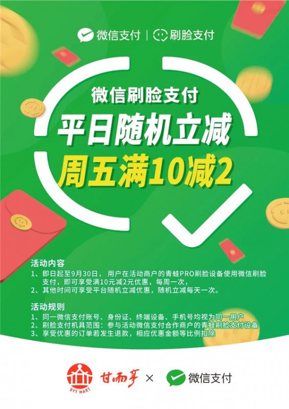 今天小雨給大家?guī)硪粋€好消息:那就是:即日起至9月30日在甘雨亭使用微信刷臉支付可享受隨機立減優(yōu)惠 周五滿10減2 周五滿10減2 (注:每人每周可享一次優(yōu)惠,名額有限先到先得。) 平日隨機立減 ...